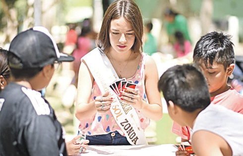 Oriana Sancasani, la candidata de Zonda, también arrancó su campaña en la Colonia de Verano. Pero ella optó por la parte lúdica. Se pasó toda una mañana jugando al ‘uno’ (juego de cartas) con los chicos. En tanto que Florencia Gómez, la representante de Caucete, encaró una promoción doble, tanto para ella como para la gente trabajadora de su departamento. Visitó a los comerciantes de la zona céntrica y hasta los que tienen sus locales en el oratorio de la Difunta Correa. No sólo se tomó fotos junto a ellos, sino que además les entregó un afiche con su imagen para que pegaran en sus vidriaras.