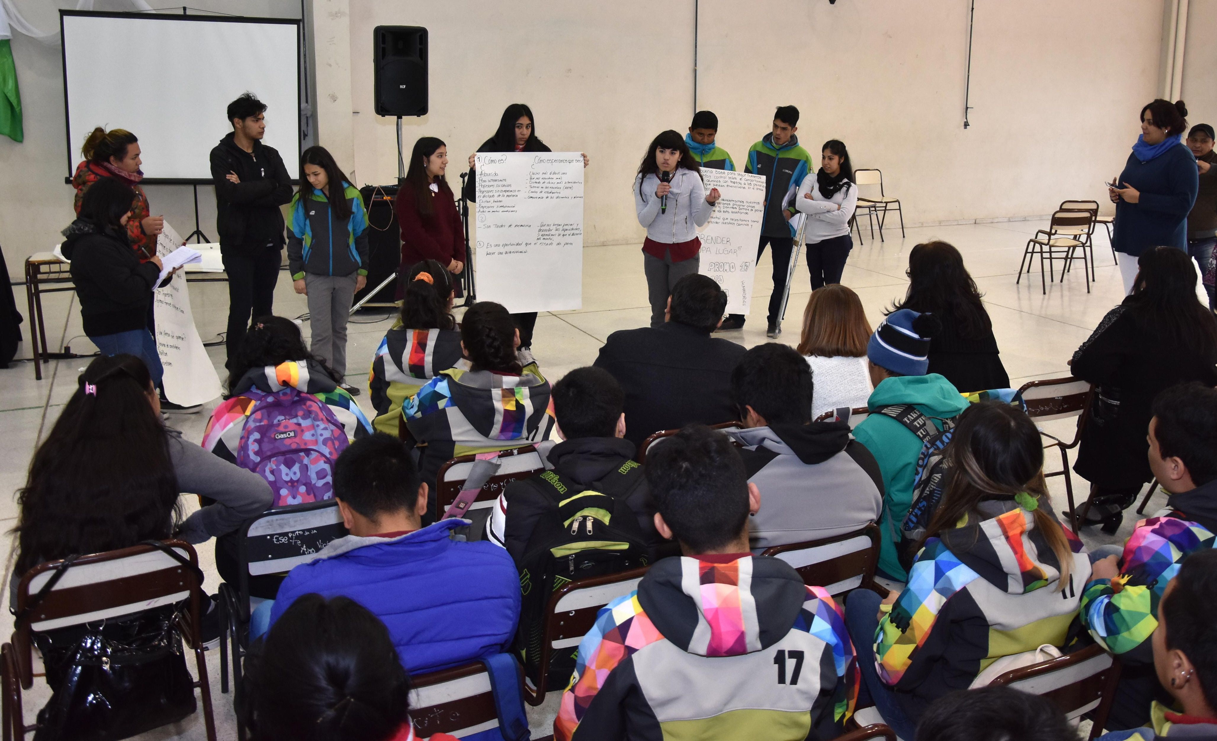 Durante este encuentro, que se realizó para analizar los resultados de la Evaluación Aprender (ver aparte), los estudiantes del Colegio Secundario Jorge Luis Borges de Chimbas hicieron afiches y pidieron algunos cambios para mejorar su nivel educativo y el de los chicos de otros años. Nuevas metodologías de estudio, para que no deban estudiar conceptos de memoria, y más capacitaciones a los docentes en áreas tecnológicas encabezaron la lista de pedidos de los chicos. El primer operativo territorial fue en Chimbas, porque fue el departamento con peores resultados en el Operativo Aprender.