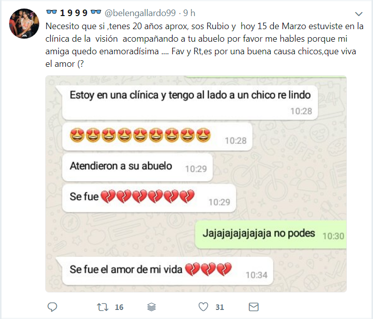 Necesito que si ,tenes 20 años aprox, sos Rubio y hoy 15 de Marzo estuviste en la clínica de la visión acompañando a tu abuelo por favor me hables porque mi amiga quedo enamoradísima …. Fav y Rt,es por una buena causa chicos,que viva el amor (? pic.twitter.com/ArinsXAzsQ
