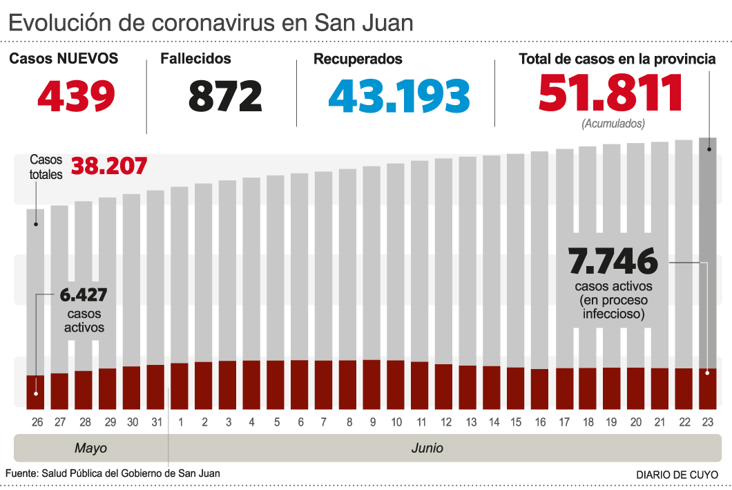 Por otro lado, hubo 439 casos confirmados en las últimas 24 horas y el acumulado ahora asciende a 51.811 infectados en toda la pandemia. Hay 7.746 personas con proceso infeccioso y de ellos, 260 se encuentran internados. A su vez, 127 pacientes se encuentra en terapia intensiva, 59 de los cuales requieren asistencia respiratoria mecánica.