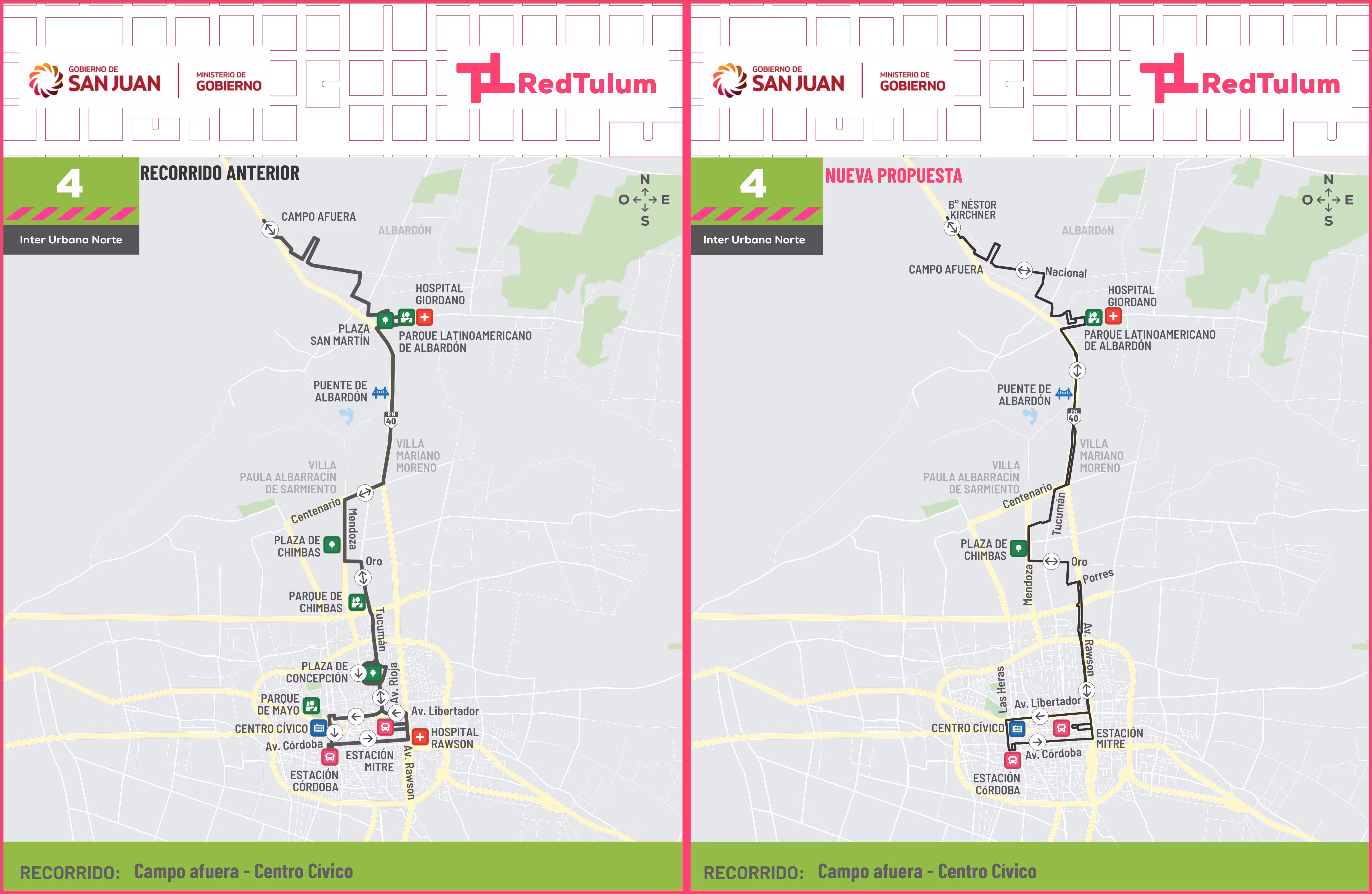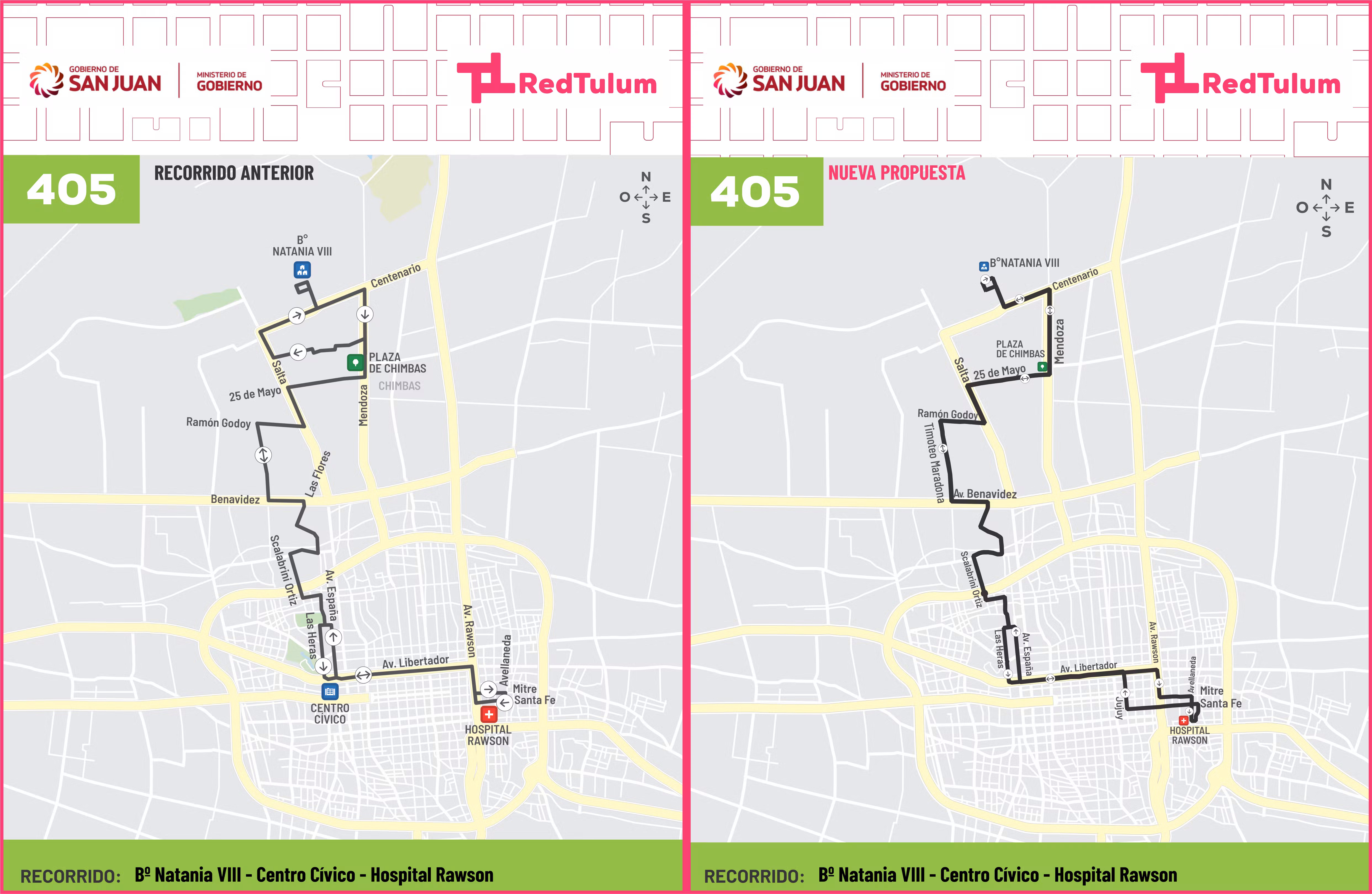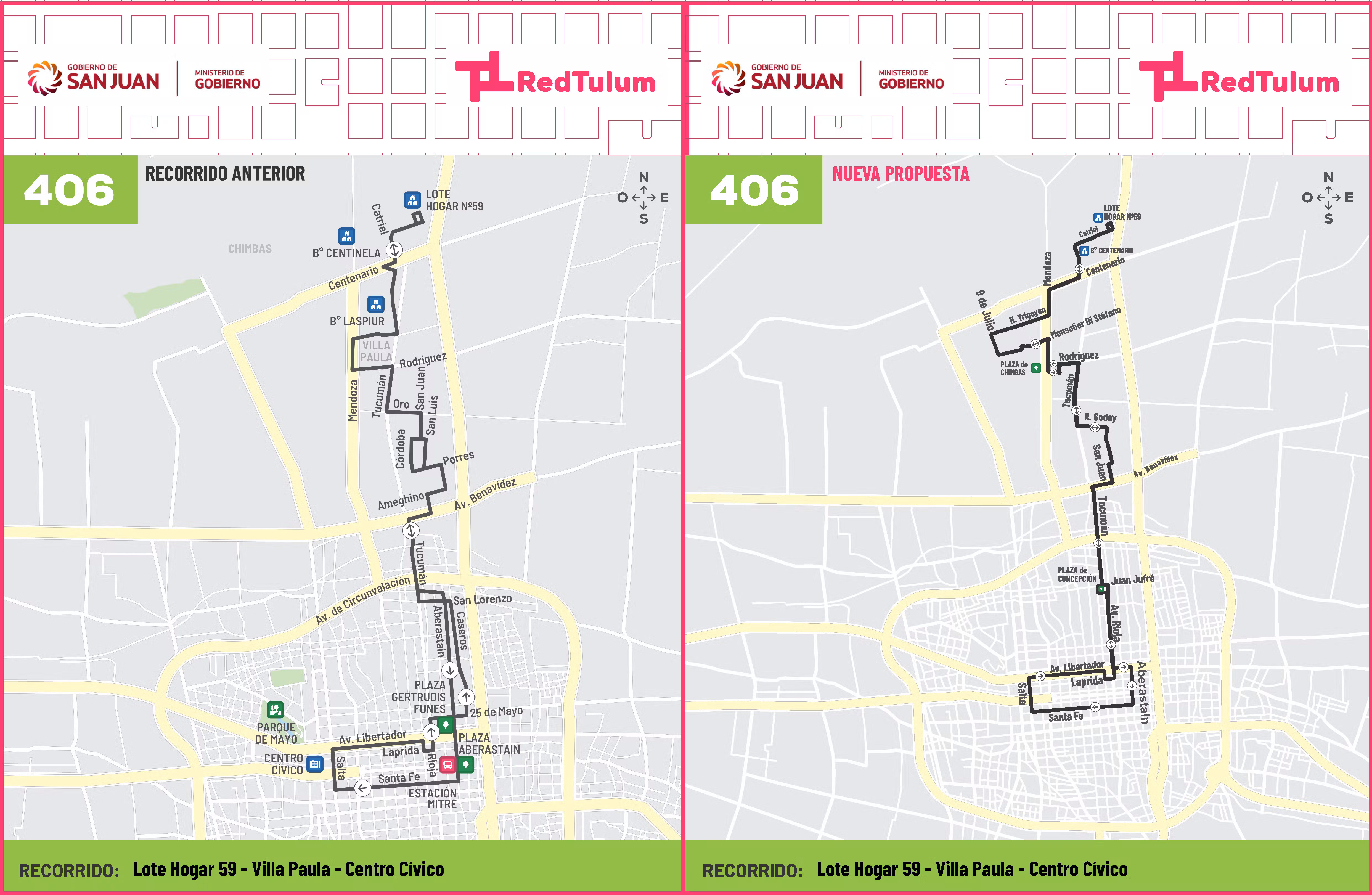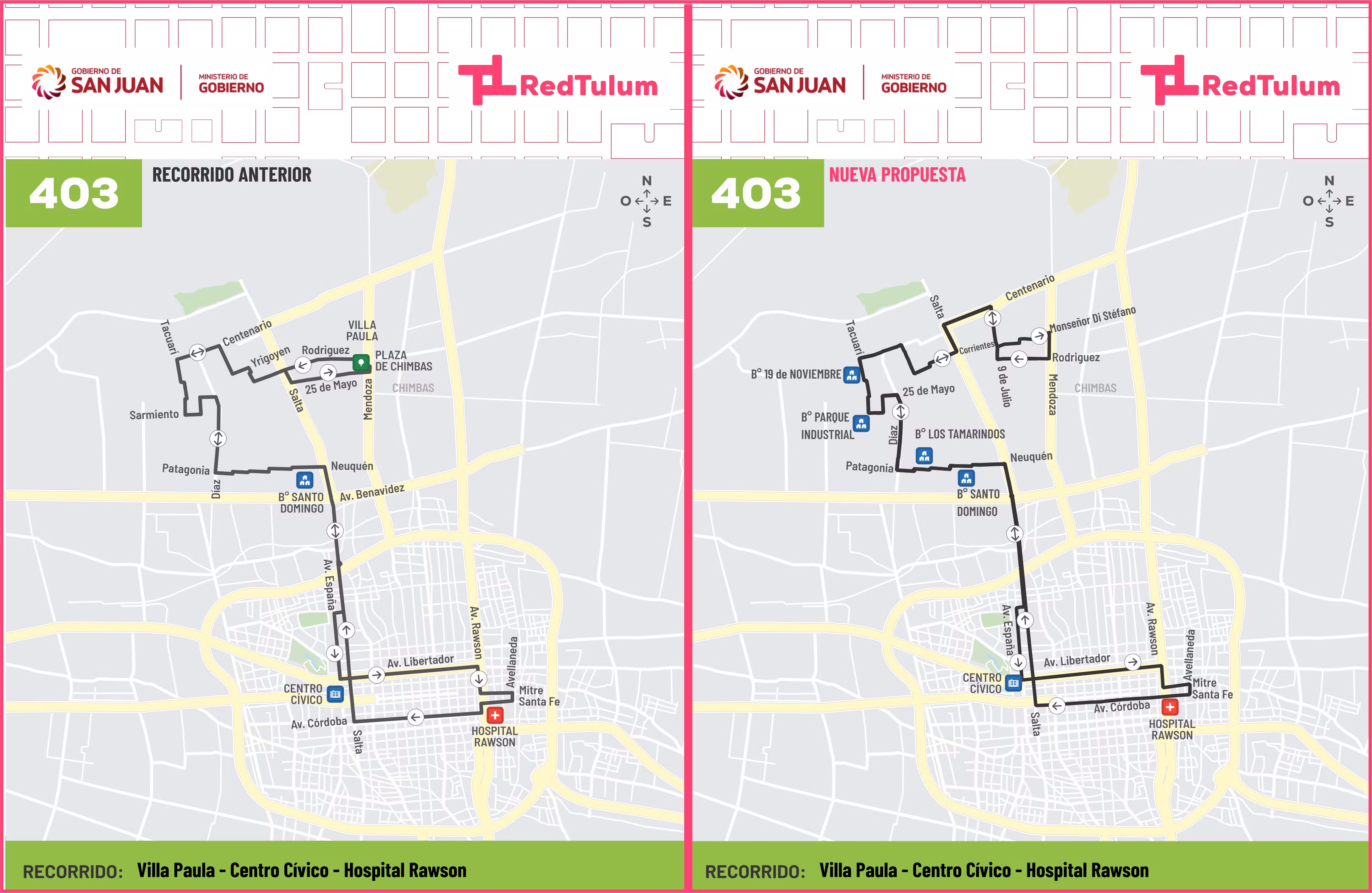 El equipo técnico de RedTulum informó los cambios a los recorridos de las líneas 4, 403, 405 y 406, que surgen como respuesta de diversas reuniones del Consejo Comunitario para el Transporte Público en el departamento Chimbas, siguiendo los lineamientos pedidos por el gobernador Sergio Uñac y el ministro de Gobierno Alberto Hensel. Las modificaciones fueron consensuadas con diferentes sectores, logrando una proyección integral del transporte.