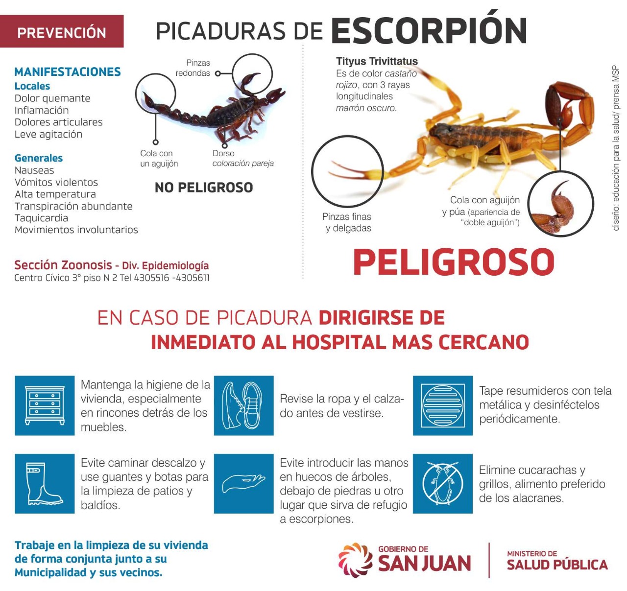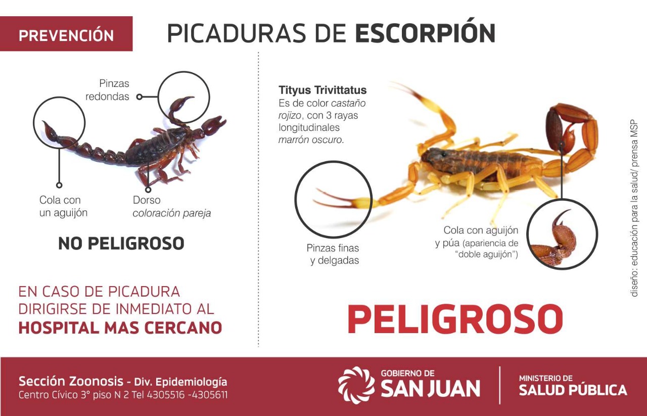 En los últimos días comenzaron a surgir denuncias de vecinos por aparición de escorpiones en distintas zonas. En ese contexto, desde el Ministerio de Salud recordaron que la aparición de las temperaturas cálidas, es común y recurrente la aparición de insectos y arácnidos que no se han manifestado a la vista en los meses más fríos. “Debido a esto, es preciso reconocer cuáles son los que pueden causar problemas a la salud y prevenir las picaduras, sobre todo, de los más venenosos”, afirmaron en un comunicado.