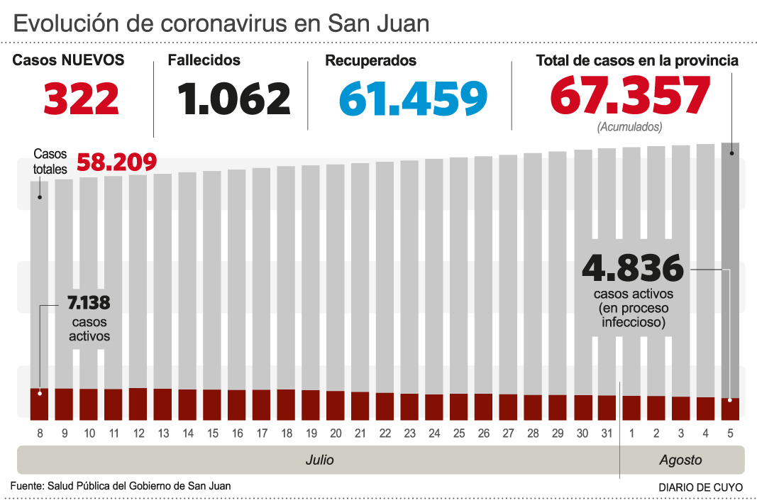 Por otro lado, fueron detectados 322 nuevos casos y el acumulado asciende a ahora a 67.357 infectados. En paralelo, sigue bajando la cantidad de personas con proceso infeccioso y ayer fueron informadas 4.836, prácticamente la mitad del pico registrado a principios de junio, cuando en San Juan había 9.396 personas enfermas a la misma vez. Hay 182 internados y de ellos, 96 permanecen en terapia intensiva (40 con asistencia respiratoria mecánica), mientras que la ocupación de camas UTI es de 68%.