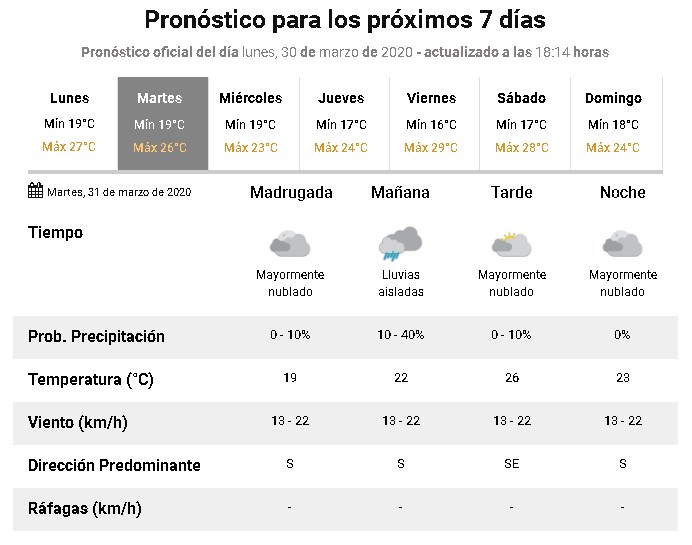 Lo mismo se espera para los próximos días, con el agregado de tormentas aisladas con buenas posibilidades de chaparrones (40%). Es que según el pronóstico del Servicio Meteorológico Nacional , para mañana la mínima será de 19º, la máxima de 26º (apenas dos grados más que hoy), con vientos de hasta 22 Km/h predominantes del sector Sur.