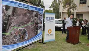 “Este proyecto asegurará el suministro de agua de excelente calidad por 50 años más” destacó entusiasmado el titular del ejecutivo provincial luego de descubrir el gran plano de la construcción del Acueducto Gran Tulum, que tendrá una longitud de 16 km desde los esteros del Zonda hasta la planta potabilizadora de Marquesado.