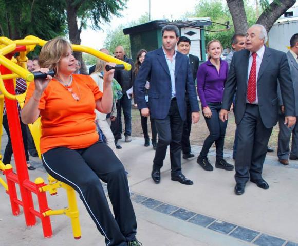 �Desde ayer, la plaza Evita, de Villa América, cuenta con los aparatos para hacer gimnasia, parte del plan saludable de Capital. Estuvieron el intendente Marcelo Lima y el vicegobernador Sergio Uñac.