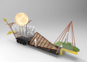 La escenografía del carro oficial también remitirá a un mundo cósmico. El elemento preponderante será una esfera roja de grandes dimensiones que representará tanto a la Luna como a la Tierra, para simbolizar algunos fenómenos astronómicos como los eclipses y la alineación de planetas.
