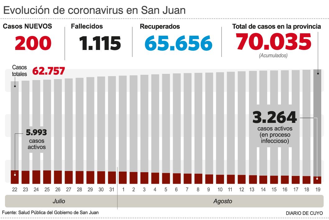 El Ministerio de Salud Pública informó 200 casos positivos de covid detectados ayer y esto hizo que San Juan superara otra barrera en las decenas de miles de afectados. Es que ahora el acumulado en pandemia es de 70.035 contagiados.
