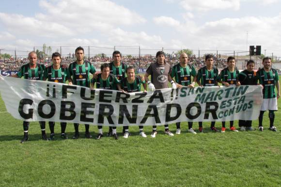 El apoyo al gobernador José Luis Gioja, tras el accidente que sufrió el pasado viernes en Valle Fértil cuando se precipitó el helicóptero que lo trasladaba, y que por la gravedad del hecho lleve a que hoy siga internado al igual que los acompañantes de la nave que sobrevivieron, recibieron el apoyo a la distancia de los jugadores de San Martín, quienes antes del inicio del partido desplegaron una bandera que decía +Fuerza Gobernador, San Martín está con vos+.