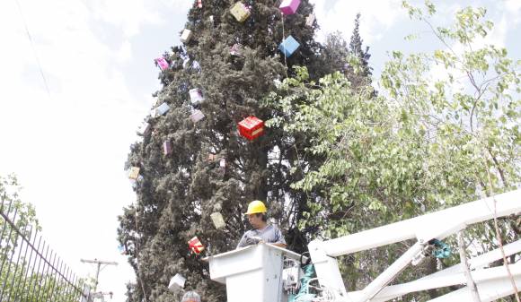 Ayer, obreros de la Municipalidad de Rawson comenzaron a adornar con luces y cajas de regalo un pino gigante del patio de la Escuela Hogar para transformarlo en Árbol de Navidad. Es tan alto que lo adornaron sólo hasta la mitad.