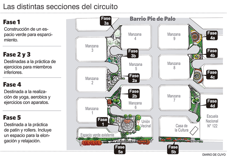 Para una mejor organización y un mayor aprovechamiento del espacio, el circuito se dividirá en 5 fases. En la número uno habrá un sector dedicado al esparcimiento, mientras que la 2 y 3 estará destinada a la ejercitación de los miembros inferiores. Para ellos los vecinos contarán con bicicletas fijas y caminadores. También habrá carteles que guíen una caminata o trote suave con tiempos y distancias recomendables para cada tipo de rendimiento físico.