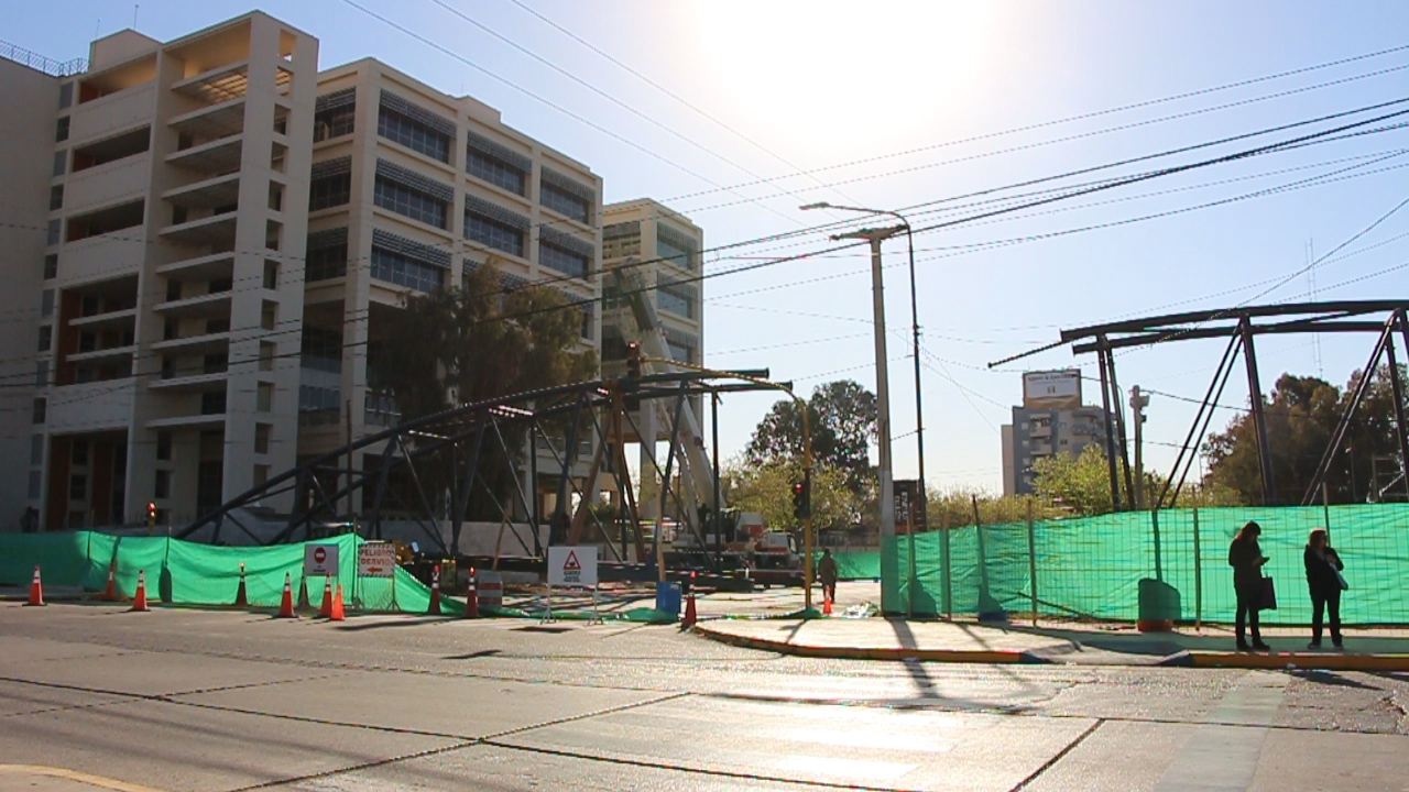 Este sábado, en la esquina de Ignacio de la Roza y España, un grupo de obreros con ayuda de grúas comenzó las tareas de ensamble del colosal puente que unirá el Centro Cívico con la Plaza del Bicentenario. Está previsto que la tarea finalice el próximo 11 de septiembre.