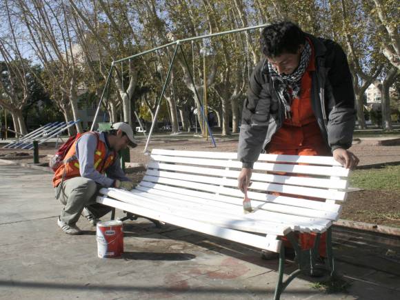 La Municipalidad de la Capital comenzó ayer con los trabajos de reparación de la plaza Laprida que tiene los bancos rotos, los árboles pintados con aerosol, el piso y los papeleros rotos.
