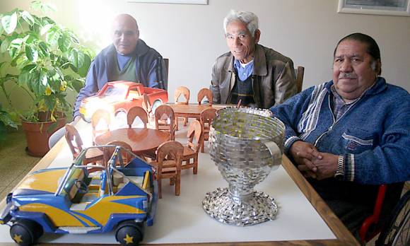 Ya sea como un pasatiempo, por placer o por puro arte, Juan, Eleuterio y Ricardo crean sus artesanías en la Residencia para Adultos Mayores Eva Duarte de Perón, donde viven. Se encargan de idear cada una de sus creaciones, buscan los materiales y ponen manos a la obra. Lejos de quedarse quietos trabajan todo el día en sus talleres. Y, en algunos casos, exponen y venden sus producciones para ganarse unos pesitos.