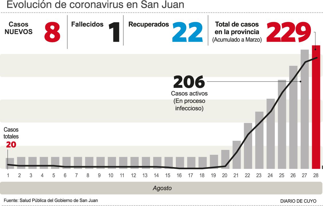 Aquel miércoles 19 de agosto detectaron 4 casos positivos en Caucete y una semana después ya eran 90; en tanto que el brote tuvo expansión por contactos estrechos en barrios de Santa Lucía, Capital, Rivadavia, San Martín, Angaco, Chimbas, Rawson, Pocito o 25 de Mayo. Además, un caucetero en este periodo perdió la vida, pues el hisopado post mortem determinó que tenía coronavirus y por ende fue la primera víctima mortal en San Juan con la enfermedad.