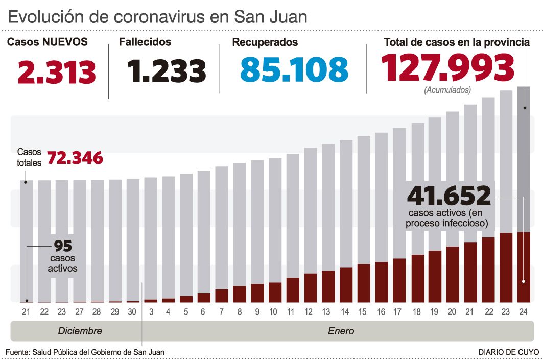 Ayer Salud Pública informó que murieron de covid otros cuatro sanjuaninos: tres mujeres (de 71, 76 y 91 años) y un hombre de 71 años. Además, en la última jornada fueron detectados 2.313 nuevos casos de covid en la provincia, con lo que el total acumulado ya quedó muy cerca de los 130 mil.