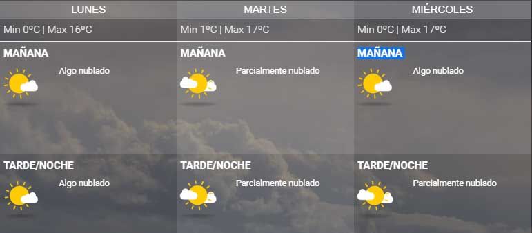 Entre lunes y miércoles se esperan temperaturas máximas que rondarán los 17 grados. La temperatura mínima no superará el grado sobre cero. El cielo se presentará parcialmente nublado.