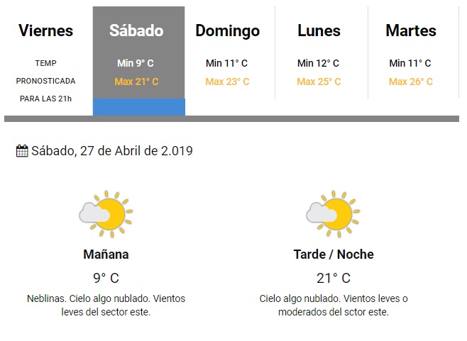 Para el domingo, la máxima se elevará hasta los 23°C mientras que para el inicio de la semana, oscilará entre los 25 y 26 grados.