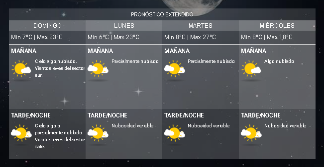 La jornada dominguera se presentará con cielo algo nublado y vientos leves del sector Sur, rotando hacia el Este por la tarde-noche.