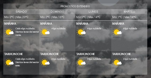 Para el domingo, la máxima será de 16 grados y la mínima de 2 grados. Para el lunes y martes, pronostican máximas de 14ºC para el lunes y martes con mínimas de 0 y 1 grado, respectivamente.