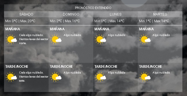 Para este sábado se espera que la máxima llegue a los 22ºC mientras que la mínima marcará 0ºC, según la página digital del Servicio Meteorológico Nacional.