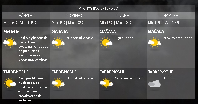Comienza el fin de semana largo y las temperaturas bajas imperan en la provincia. Según el SMN, para este sábado la máxima llegará hasta los 10ºC mientras que la mínima será de 5ºC.