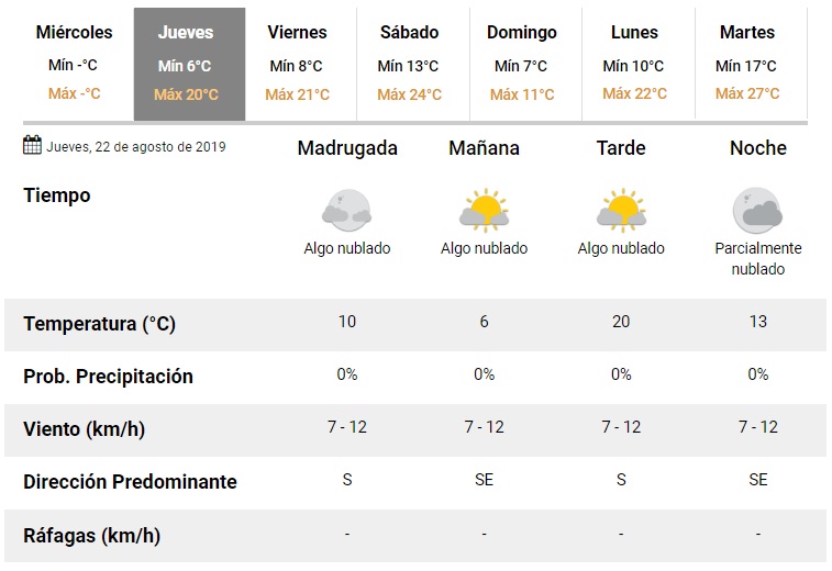 Este jueves, la temperatura se elevará hasta los 20°C y la mínima caerá hasta los 6°C, según lo que informa el Servicio Meteorológico Nacional.