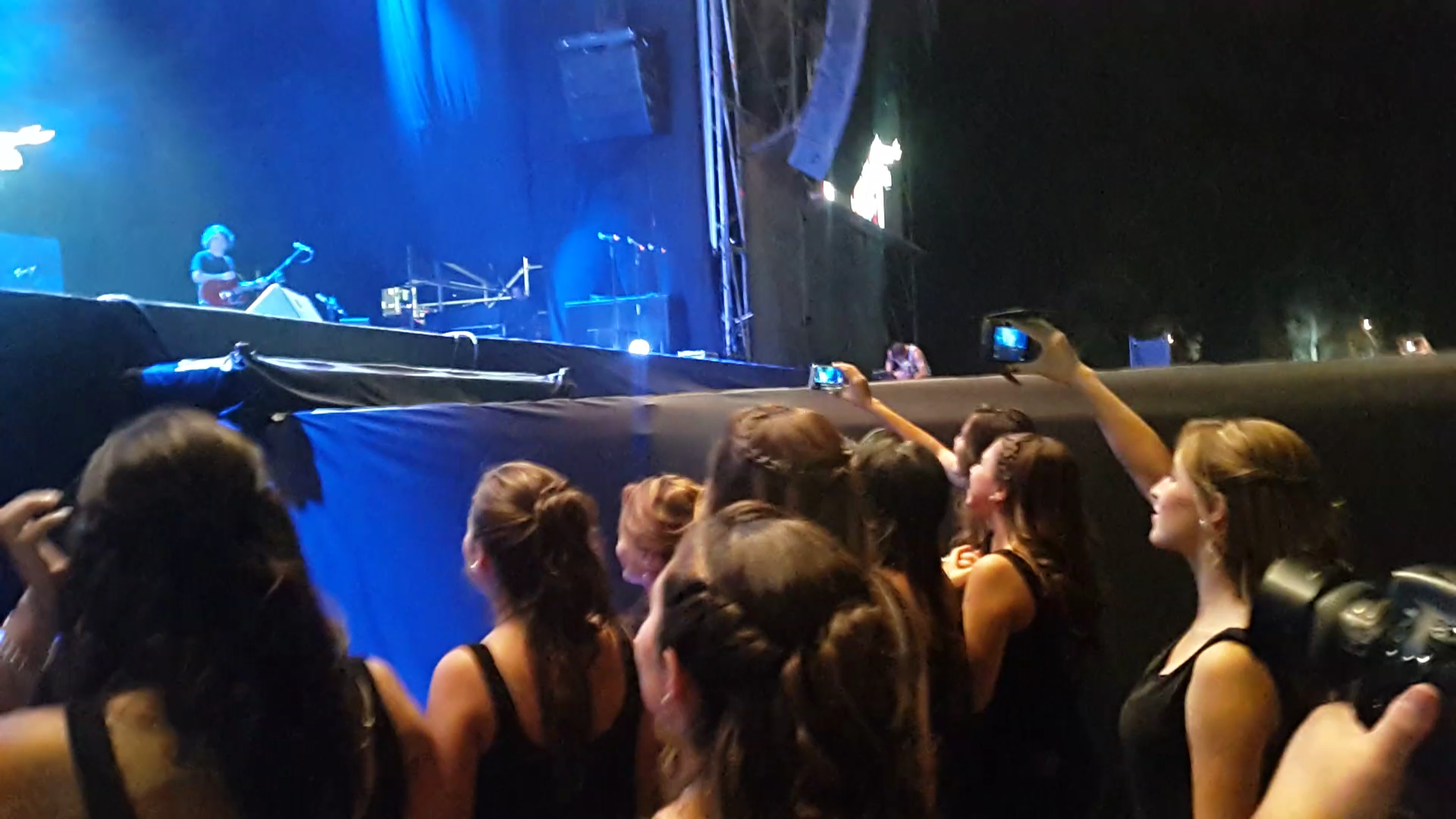 Las chicas, que se cambiaron los vestidos largos de gala por jeans y remeras -por una cuestión de comodidad-, fueron ubicadas en un lugar privilegiado: justo a continuación de cuando terminaba el escenario y delante de las vallas (detrás de ellas estaba el público), en un espacio amplio donde se podían mover cómodamente. Los escasos metros que las separaban de Abel hacían que cada grito de ellas llegase a los oídos del galán.