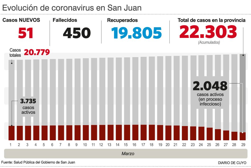 El parte de Salud Pública indicó que ayer fueron detectados 51 nuevos casos. Es un leve descenso con respecto a todo el fin de semana, que de todos modos eleva el acumulado a 22.303 contagios. De estos, hay 2.048 personas con proceso infeccioso, con 60 internados. En áreas críticas se encuentran 41 pacientes, 12 de los cuales requieren respirador. Por otro lado, crecen los recuperados y ahora hay 19.805 individuos con alta Covid.
