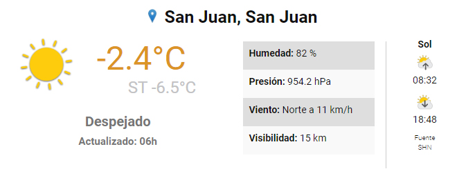 Este martes la temperatura máxima pronosticada es de 15°, pero la sensación térmica a las 6 de la mañana fue de 6.5 grados bajo cero. La real era de 2.4 grados, también bajo cero.