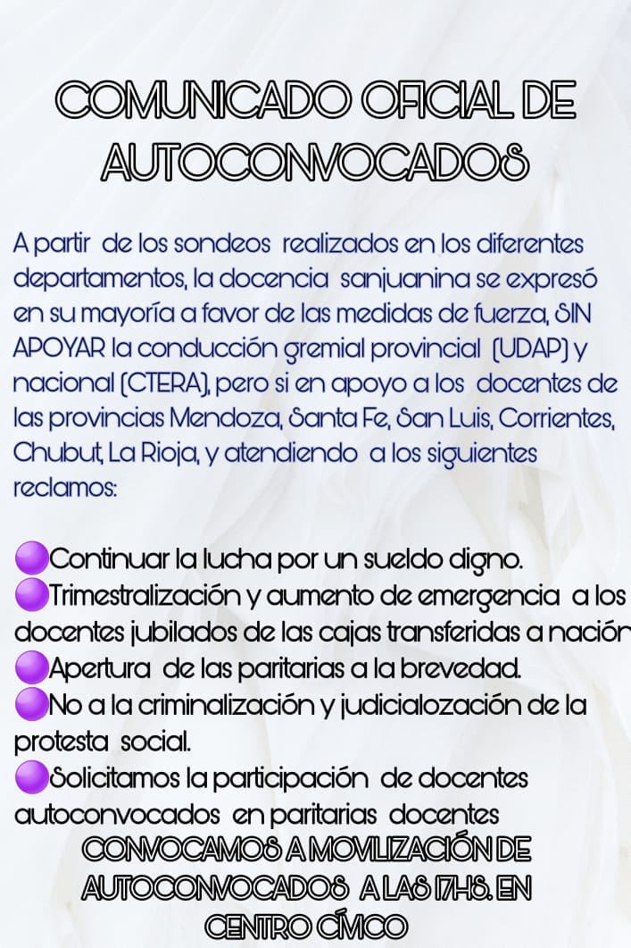 A última hora del martes los docentes autoconvocados sanjuaninos emitieron un comunicado adhieriendo al paro nacional convocado por Ctera para el día de hoy. En el texto aseguran que decidieron no presentarse a trabajar en solidaridad con el reclamo salarial encarado por sus colegas de Mendoza, La Rioja, Corrientes, Chubut, Santa Fe y San Luis