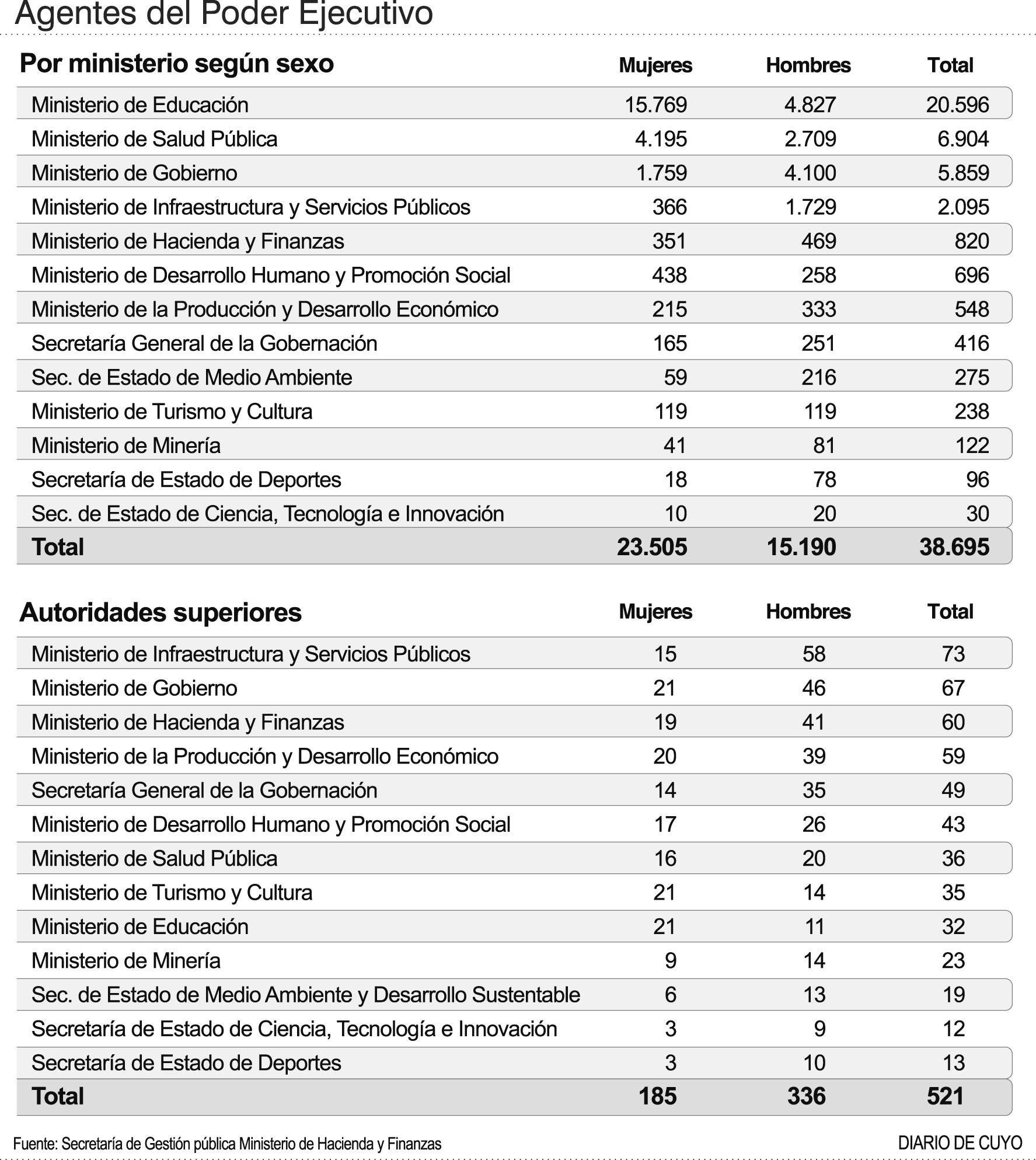 Si bien de los casi 40.000 empleados estatales, dependientes del Poder Ejecutivo, más de la mitad son mujeres, en los puestos jerárquicos la presencia masculina casi duplica a la femenina, según datos oficiales que opera la Secretaría de Gestión Pública.