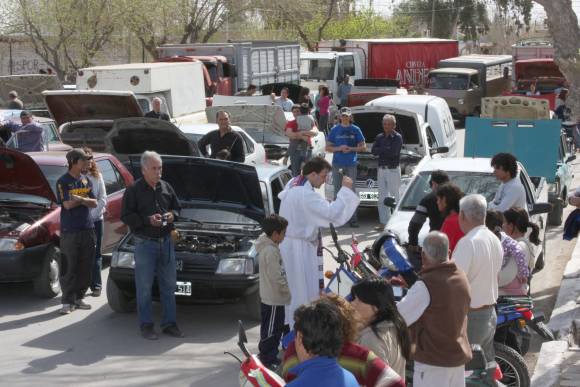 San Juan, 30 de agosto.- Más de setenta autos, camiones, motos y bicicletas llegaron hasta la parroquia de 25 de Mayo, para recibir por primera vez la bendicion por parte del padre Fabricio Pons (quien ya había realizado este ritual en San Expedito y en la Difunta Correa), en el día de Santa Rosa de Lima.