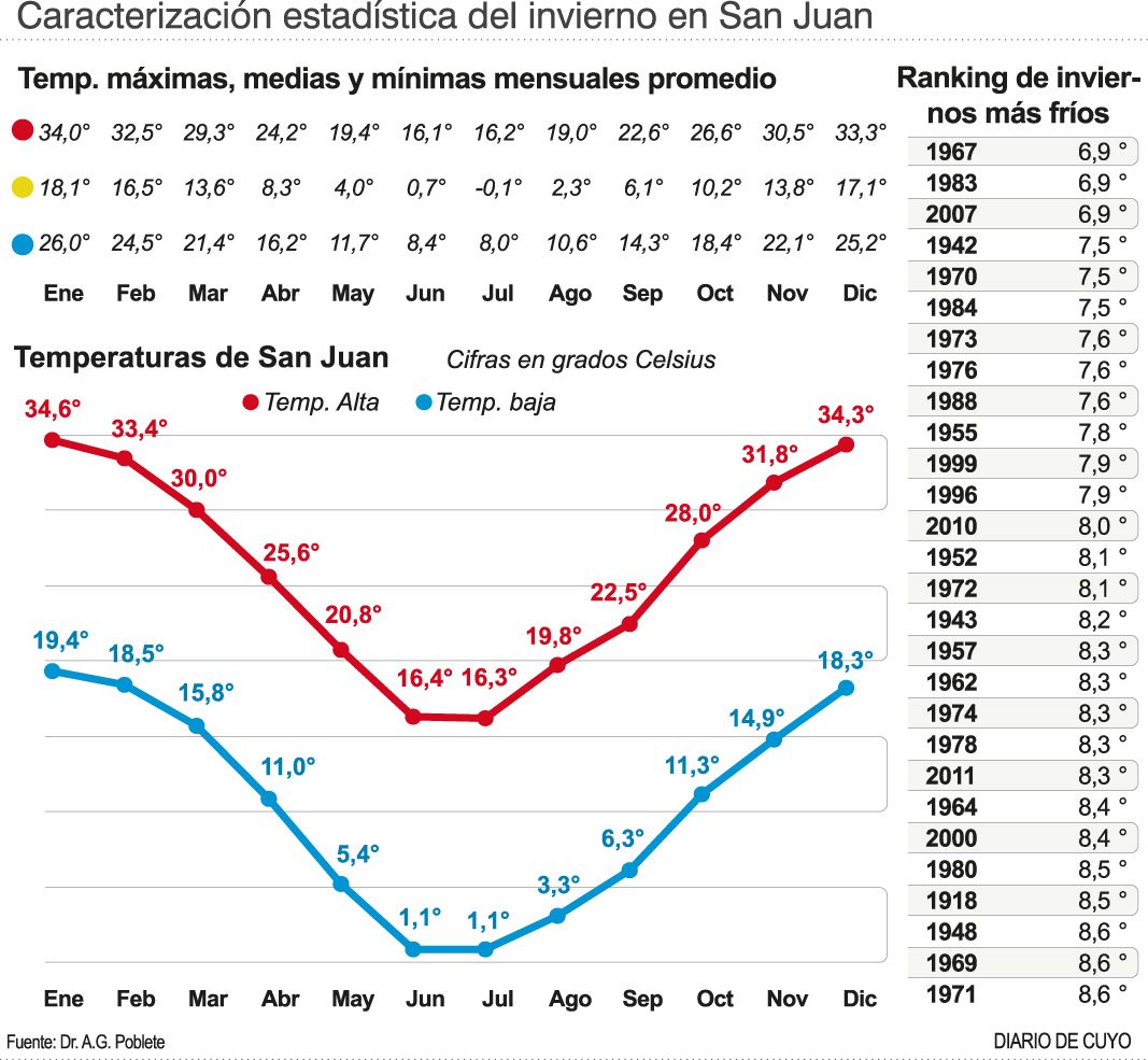 Para avanzar en la propuesta para que San Juan sea considerada como "zona fría" fue clave un informe del climatólogo Germán Poblete (ver aparte). El trabajo hace referencia a que "para caracterizar el invierno de San Juan se considera la amplitud del periodo con heladas, y su severidad mediante el número de días con olas polares".