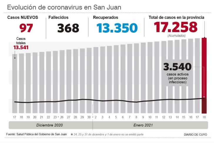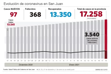 El parte de ayer también dio cuenta de un nuevo fallecimiento por Covid en la provincia. Se trata de una rawsina de 58 años que estaba internada en el Hospital Rawson. Con ella, las muertes en San Juan desde el inicio de la pandemia ya suman 368.