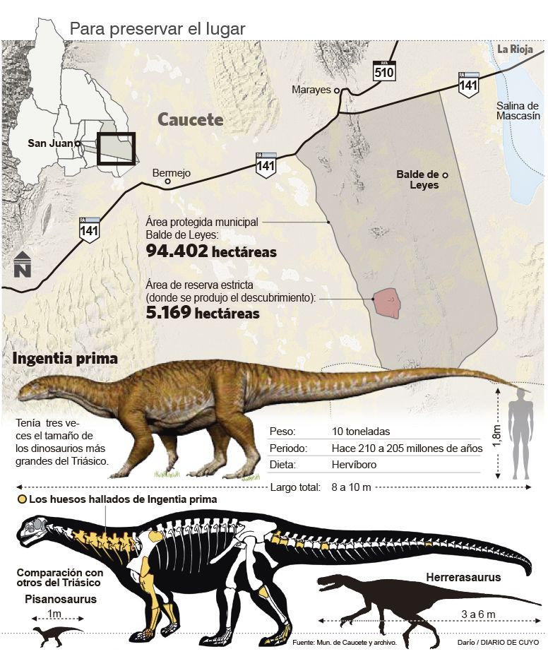 La ordenanza, que fue aprobada por unanimidad, también prevé que son de Dominio Municipal los restos paleontológicos llamados Ingentia prima (ese es el nombre que le pusieron la dinosaurio cuyo hallazgo marcó un antes y un después en la historia del gigantismo de esa clase de animales). Según la flamante norma, lo que se declaró Reserva Natural es al yacimiento Balde de Leyes-Las Torrecitas y a 5.169 hectáreas alrededor del punto de hallazgo en la cuenca sedimentaria de Marayes, perteneciente a los períodos Triásico-Jurásico (ver infografía).
