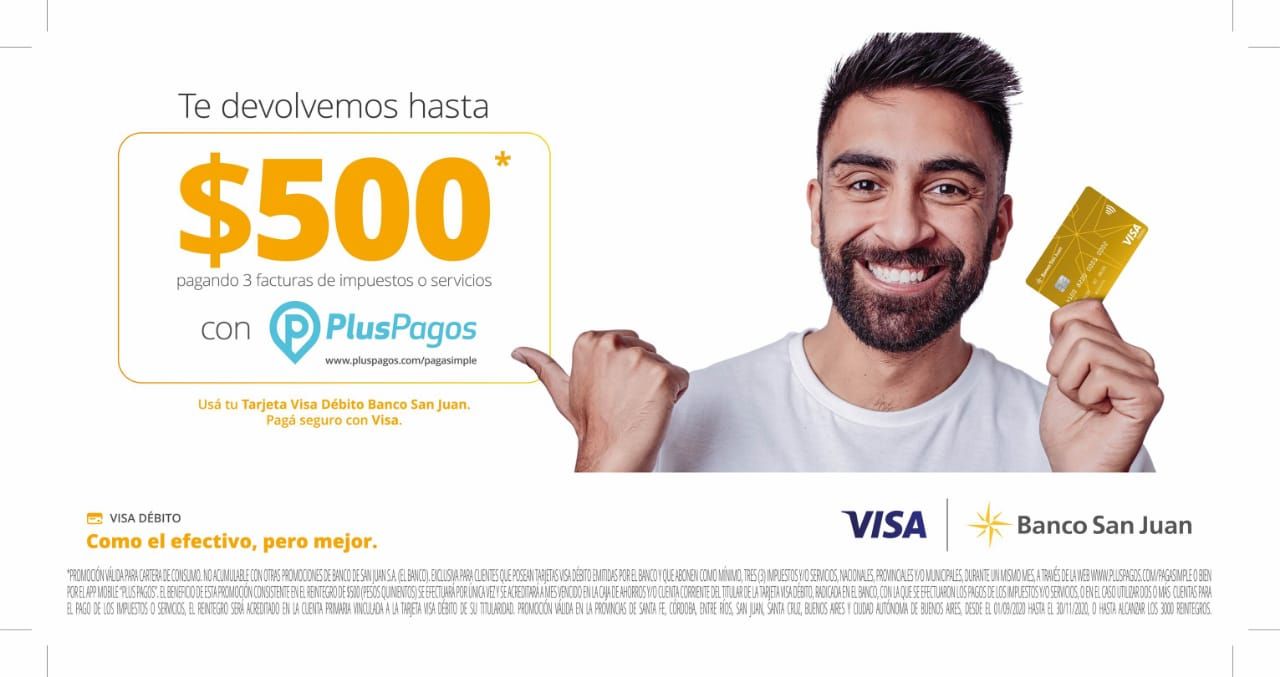 Banco San Juan y Visa lanzaron una campaña de educación financiera para promover el uso de la tarjeta de débito con un importante incentivo que consiste en la devolución de hasta 500 pesos con el pago de 3 facturas de impuestos o servicios a través de la web  o la app de PlusPagos.