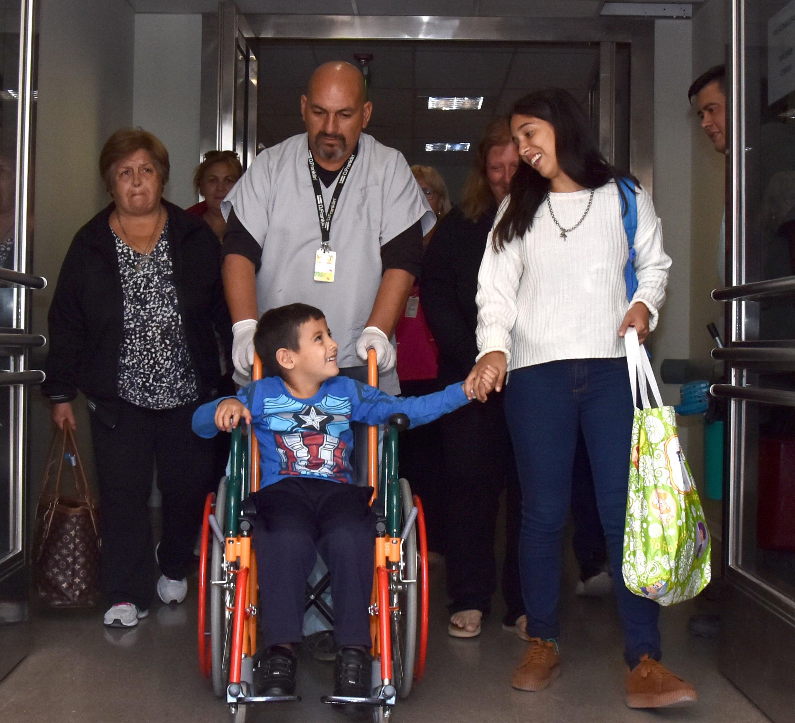 En silla de ruedas, por protocolo- y de la mano de su hermana Victoria, el “nene del milagro” salió del nosocomio entre sonrisas y pura alegría. Como era de esperar, recibió la ovación de los que se encontraban en el lugar. "¿Todos saben que me perdí?", fueron las primeras palabras del nene.