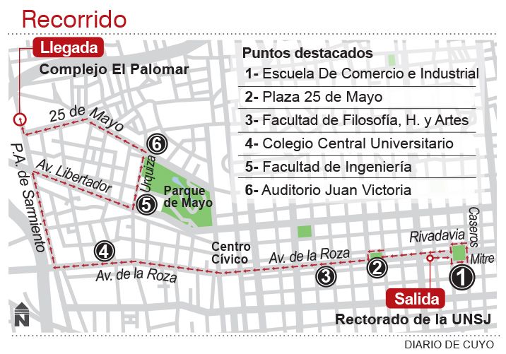 Se trata de una bicicleteada abierta y participativa por las calles de la Ciudad, que se realizará a las 15. La misma partirá desde el edificio del Rectorado y, tras dar una vuelta alrededor de la Plaza Aberastain, continuará su recorrido pasando por otras dependencias de la UNSJ como las escuelas Industrial y de Comercio, y las facultades de Filosofía e Ingeniería (ver infografía) para llegar hasta el Complejo El Palomar, donde todos podrán compartir un chocolate con sopaipillas y participar del sorteo de numerosos premios. El principal será un monopatín eléctrico.