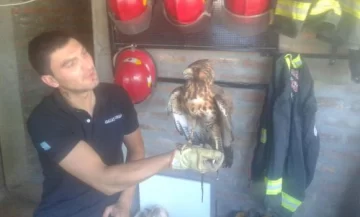 Durante toda la mañana el teléfono de los Bomberos de Santa Lucía estuvo casi en silencio. Carina Luna, la operadora del cuartel, sólo atendió algunas consultas. Sin embargo, en un abrir y cerrar de ojos todo se precipitó: un llamado los condujo a rescatar un ave, que creen que es un águila, que estaba enredada en un alambre.