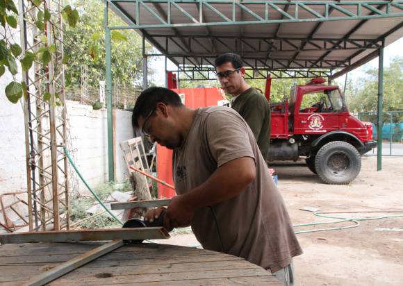 Según contó Alejandro Domínguez, jefe del cuerpo, una vez que recibieron las donaciones de metal y chapa, los 20 bomberos, que son parte del destacamento, se pusieron a trabajar. “Nos pasamos noches enteras trabajando. Tuvimos que ocupar todas las horas posibles de cada jornada porque con nuestros trabajos particulares no nos quedaba tiempo para construir el nuevo cuartel”, dijo el bombero. Lo primero que hicieron fue construir un galpón de hierro y chapa para poder proteger los 2 camiones y la camioneta con las que cuenta el destacamento. Para poder hacerlo, José Luis Alcaraz hasta utilizó la máquina soldadora de su taller mecánico y se puso a unir cada uno de los vértices del tinglado junto al resto de sus compañeros.