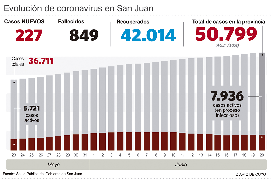 Ayer, el Ministerio de Salud Pública de la provincia informó 227 nuevos casos de coronavirus en un día, mostrando una de las cifras más bajas en mucho tiempo, y 5 muertes, la más joven correspondiente a un hombre de 47 años oriundo del departamento Rawson. De esta manera, el total de contagios se elevó a 50.799 y el de fallecidos a 849.