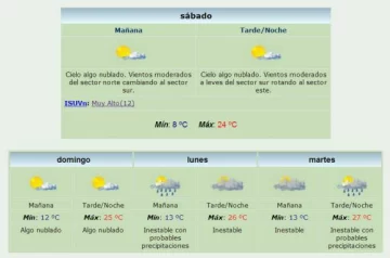 Para mañana domingo la máxima prevista es de 25 grados con una mínima de 12 y con el cielo algo nublado. Pero para el lunes hay probabilidad de lluvias para la mañana y inestable para la tarde, con una máxima que continuará sobre los 25 grados.