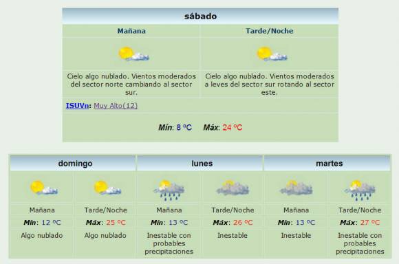 San juan, 5 de octubre.- El Servicio Meteorológico Nacional prevé para este fin de semana buen clima tanto para éste sábado como para el domingo. En el primero de los casos la máxima pronosticada es de 24 grados con el cielo algo nublado y vientos leves del sector sur rotando al este por la tarde.