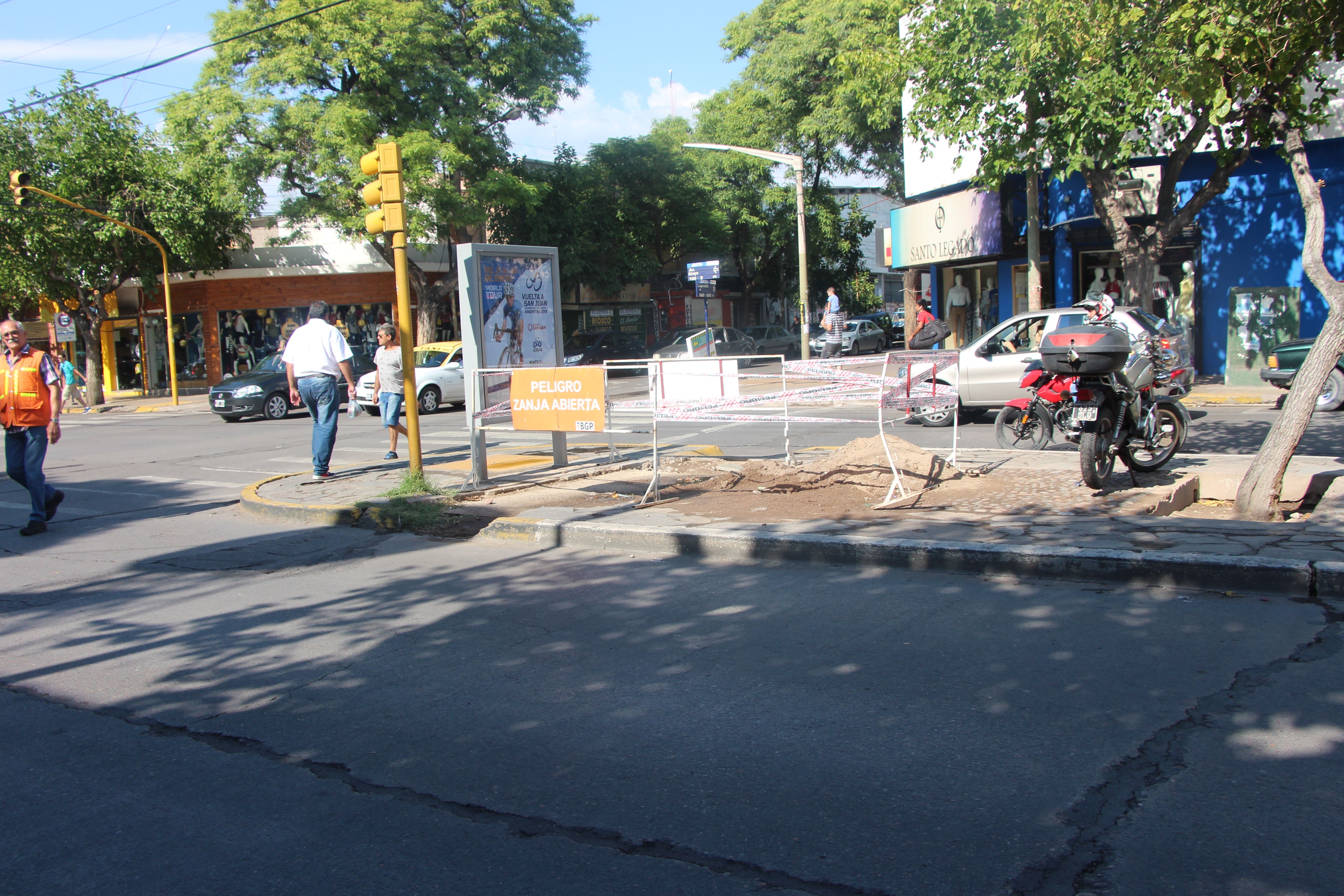 Hay una zanja abierta por reparaciones. El espacio está señalizado y rodeado por una cinta de peligro.