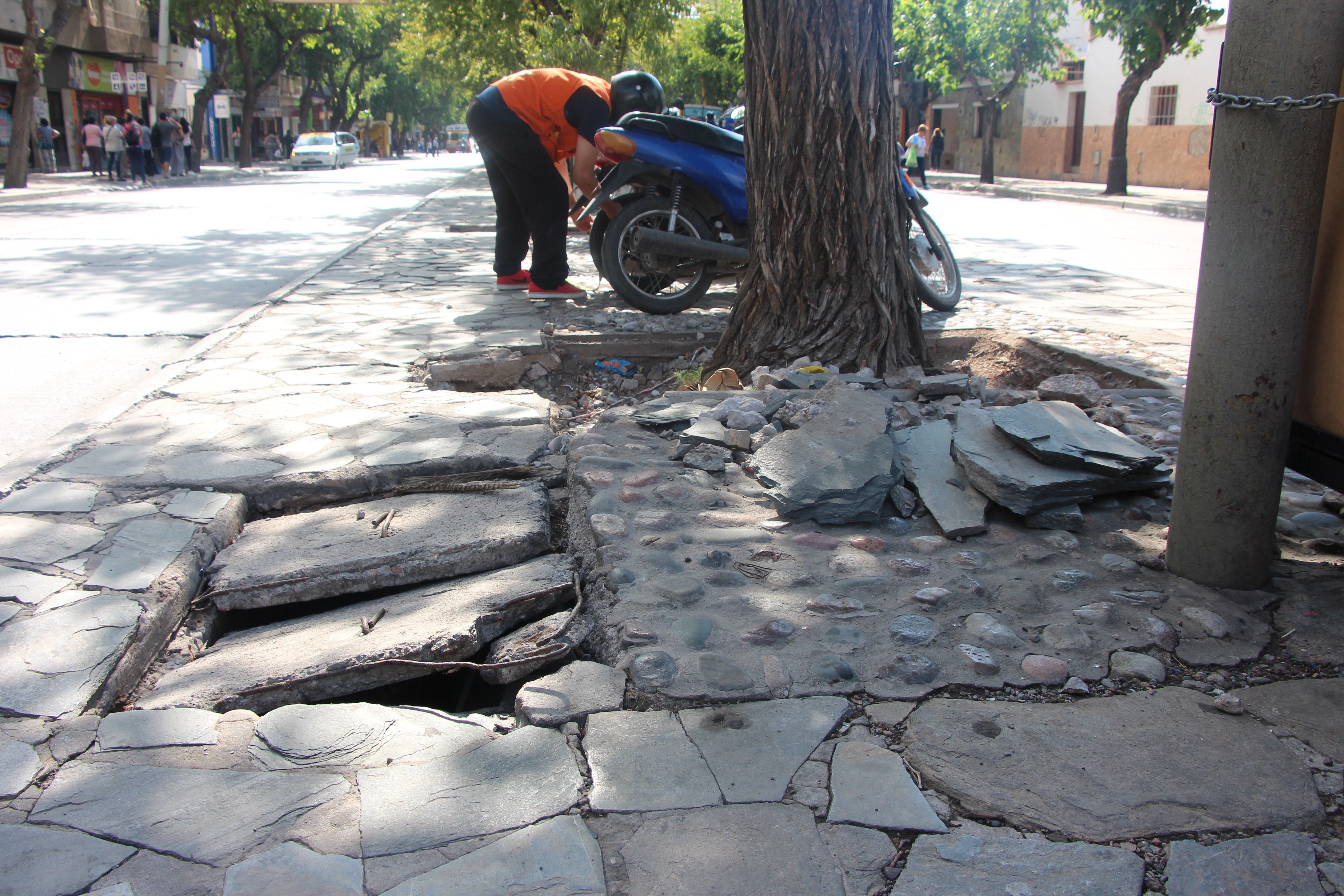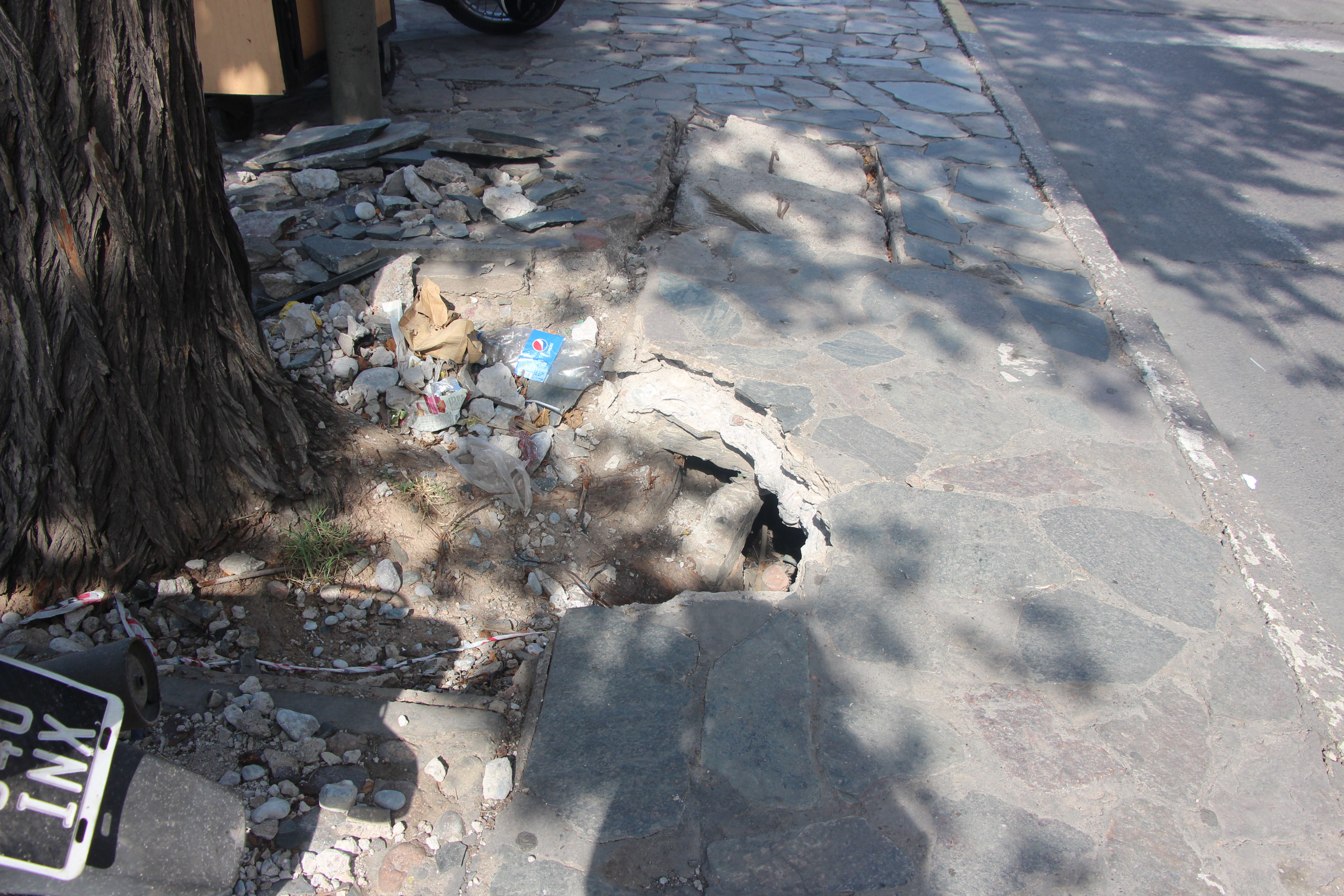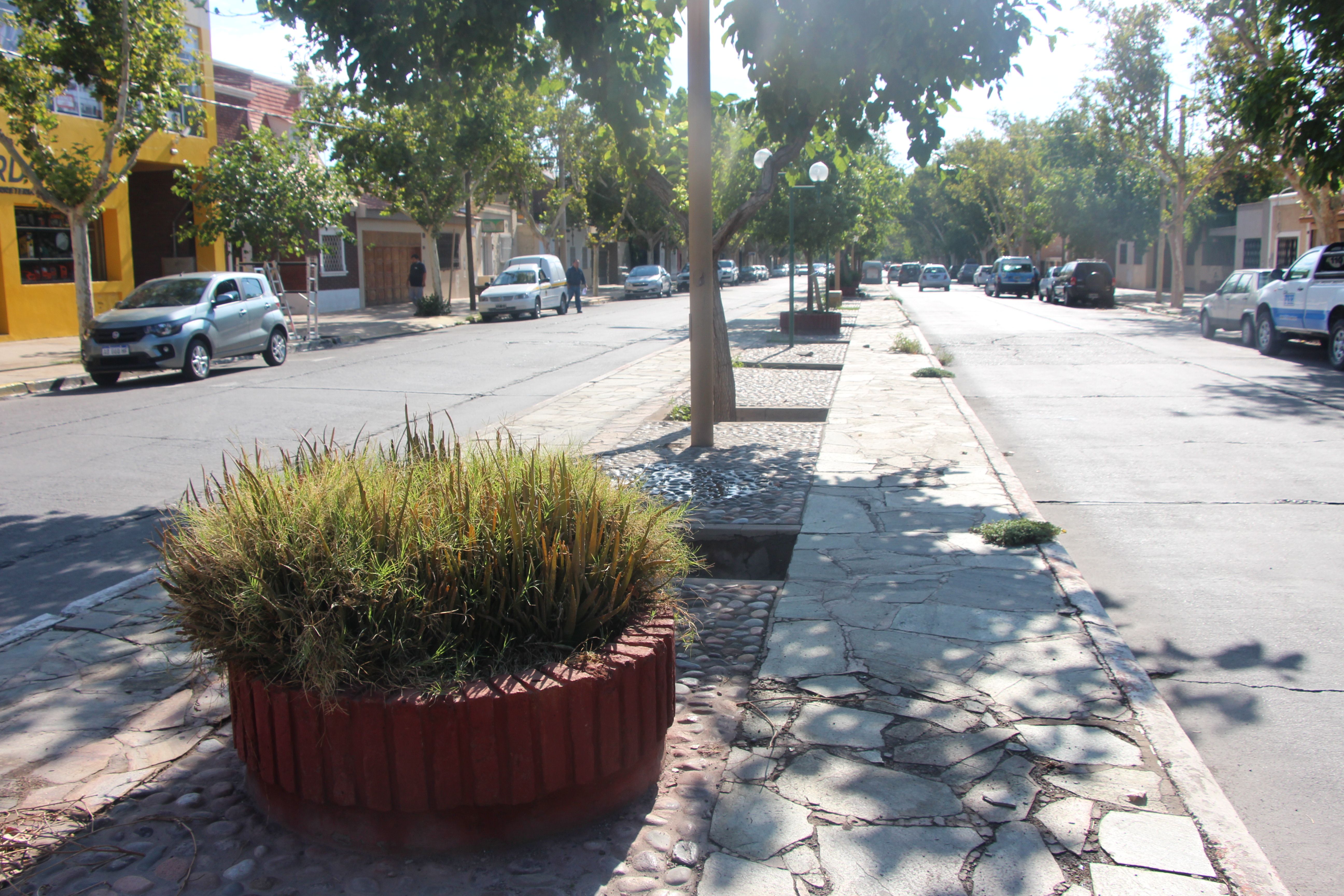 Dos pozos enormes y las tapas de la cuneta rotas sobresalen. Mientras que, los canteros están vacíos. Más adelante, a partir de Entre Ríos, hacia Sarmiento y Alem, el estado del bulevar mejora.