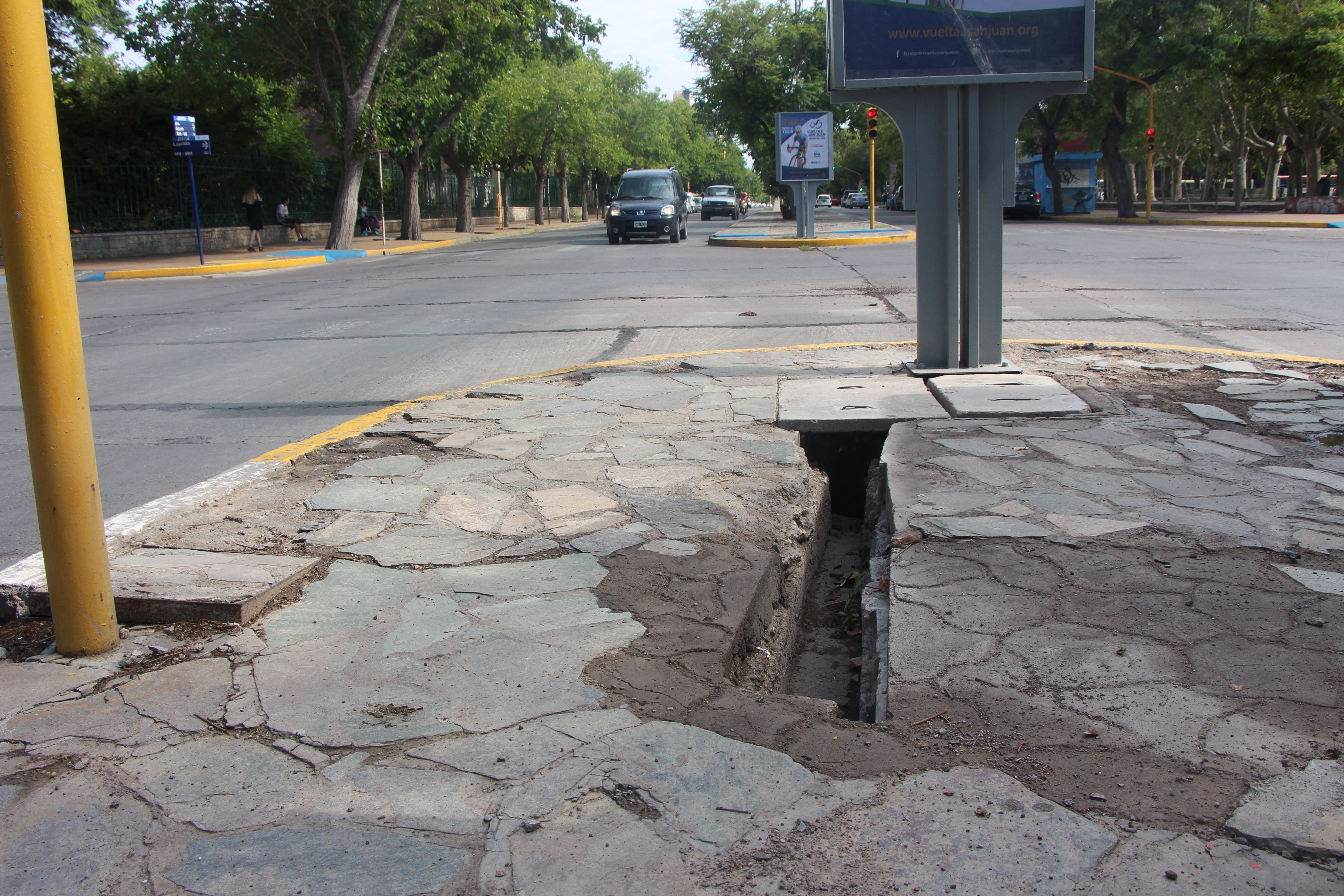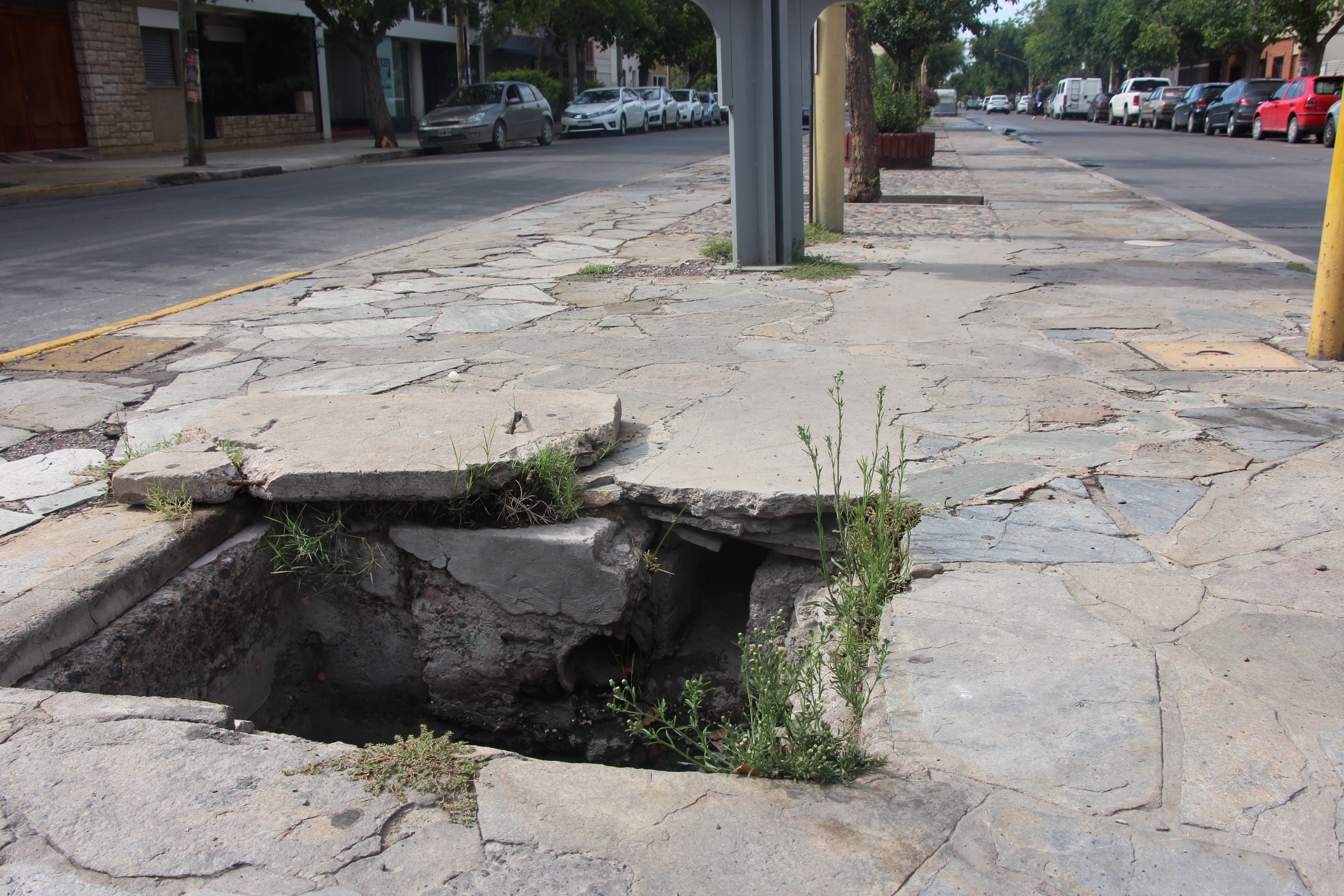 En las esquinas del bulevar las cunetas directamente no tienen tapas, por lo que se ve pozos de importante profundidad.