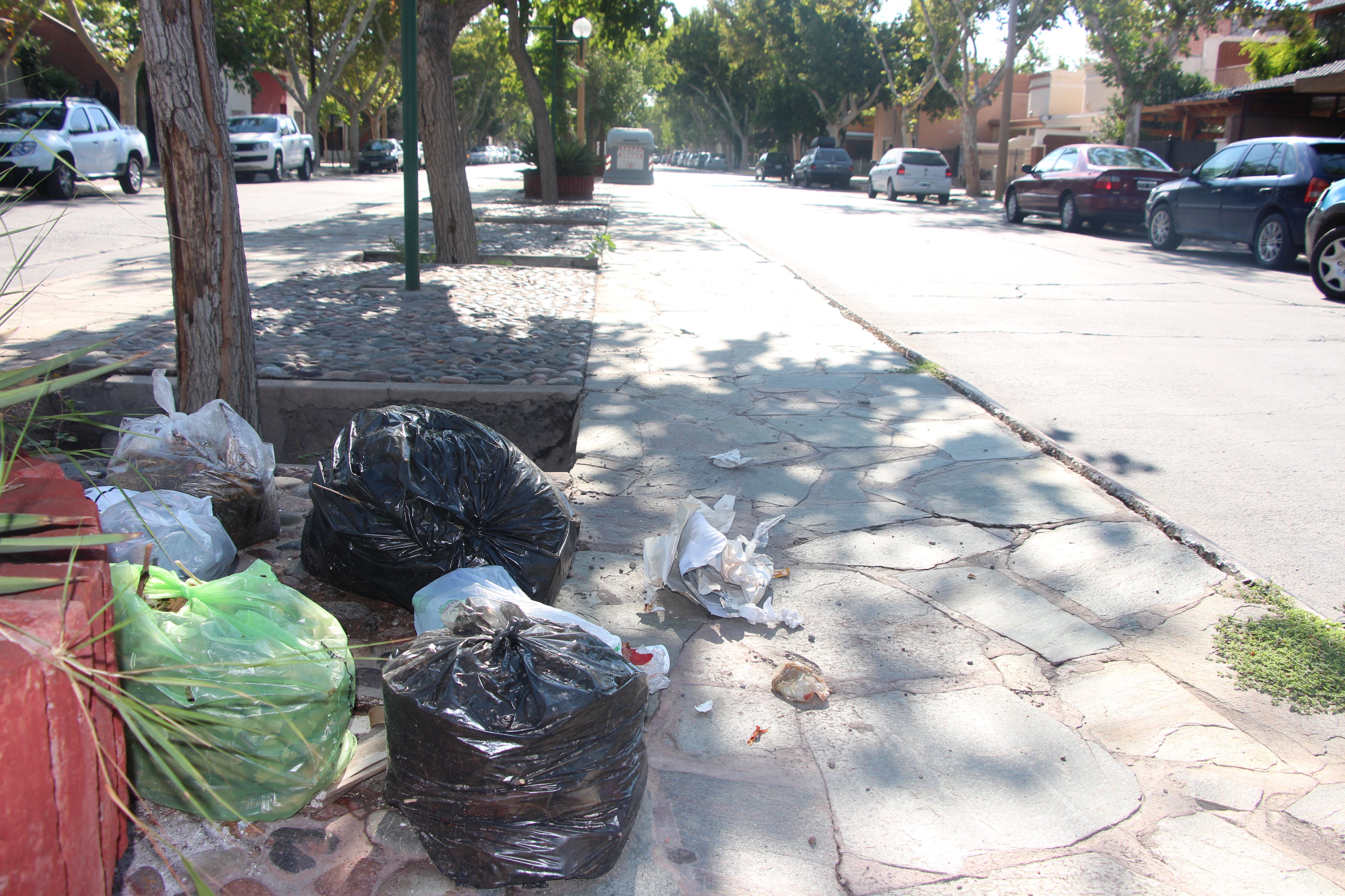 El cordón está roto y levantado. Los cantaron están cubiertos de pasto y plantas secas y se puede ver basura que la gente tira en el medio, a pesar de que a pocos metros hay un contenedor.