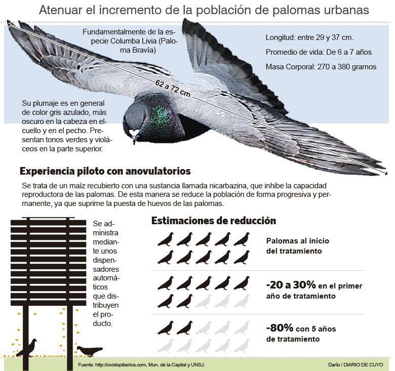 La invasión de palomas en el centro sanjuanino es un problema de vieja data. De hecho, en varias ocasiones hubo intentos por exterminarlas o controlarlas. Ahora, la Municipalidad de la Capital firmó un convenio con la UNSJ, precisamente con la Facultad de Ciencias Exactas para frenar la reproducción de estas aves. Maximiliano Suárez, director de Ambiente de la Capital, dijo que el proyecto comenzará el mes que viene y explicó que utilizarán una sustancia (anovulatoria – ver infografía) que se mezcla con el maíz y que hace que disminuya la postura de huevos.