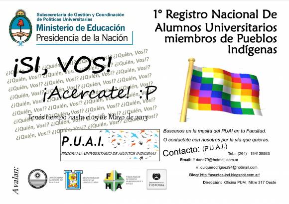 San Juan, 7 de mayo.- Impulsado desde la Subsecretaria de Gestión y Coordinación de Políticas Universitarias y con la coordinación de las Secretarías de Bienestar Universitari, se está realizando el "1º Registro Nacional de Alumnos pertenecientes a Pueblos Originarios".